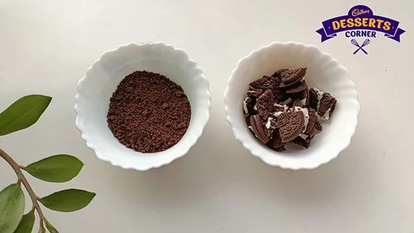Crush 5 Oreos coarsely to add to the whipped cream, and with the other 5 biscuits, make fine crumbs and set aside.