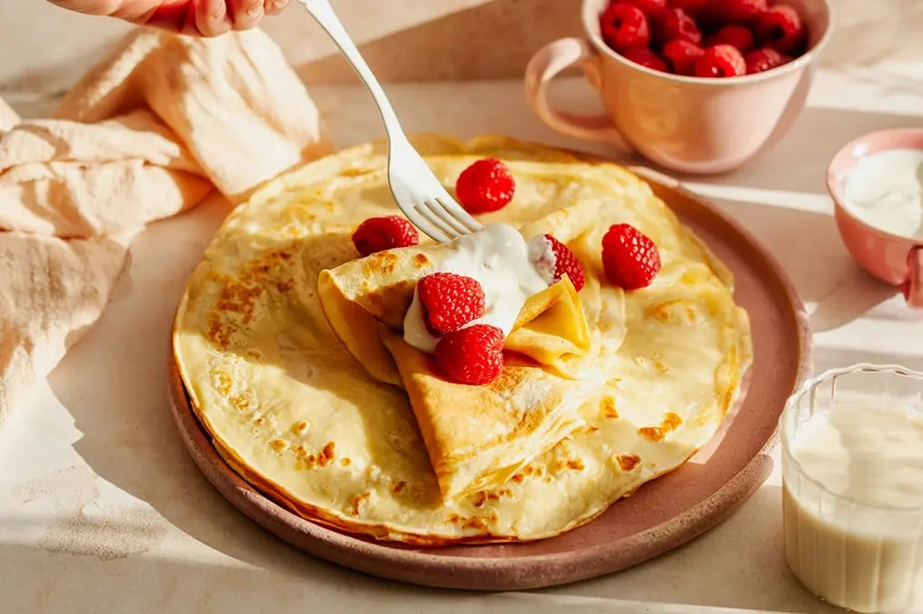 - To serve, place a dollop of lemon curd and a few fresh raspberries inside each of the crepes and shave some lemon zest into the cream before wrapping it up in a roll. Dust it with powdered sugar and citric acid (if available) and serve.