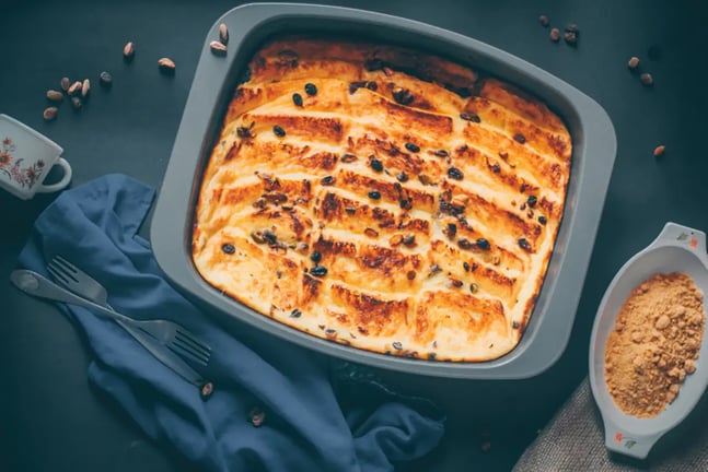 - Bake the bread pudding for 35-45 minutes, until the center is set and the top is golden brown. Remove from the oven and let it cool outside.