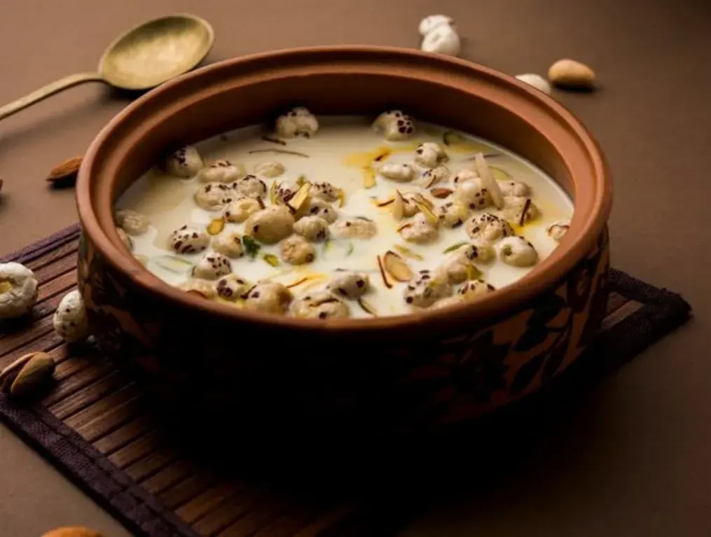 Makhana or fox nuts is a fasting staple and turning it into kheer is a sweet and healthy dessert. This vrat-special kheer is made by roasting makhana in ghee till crispy, then simmering it in boiled milk till it softens. A pinch of cardamom and chopped nuts adds to the flavor, while a natural sweetener like jaggery or honey keeps it vrat-friendly. Light and filling, this kheer is perfect to satisfy your sweet cravings during Navratri.