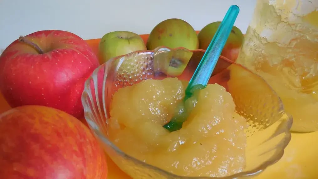 - Heat apple puree and sugar in a saucepan until sugar dissolves.