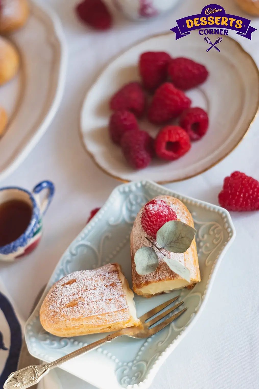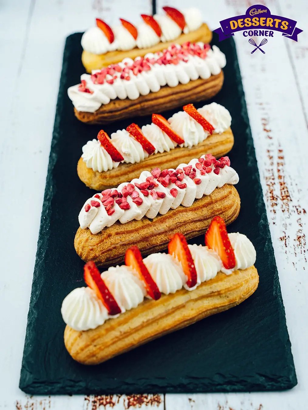Eclairs are decadently puffy desserts, a combination of a choux pastry filled with a sweet cream and topped with a delicate glaze. They are moist when you bite into them, as the bite melts easily in your mouth.