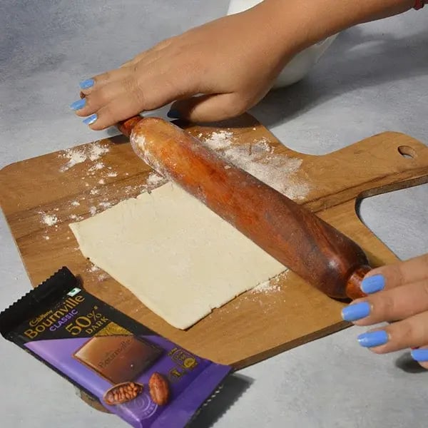 Melt Cadbury Bournville chocolate & apply one side of rolled puff pastry.
