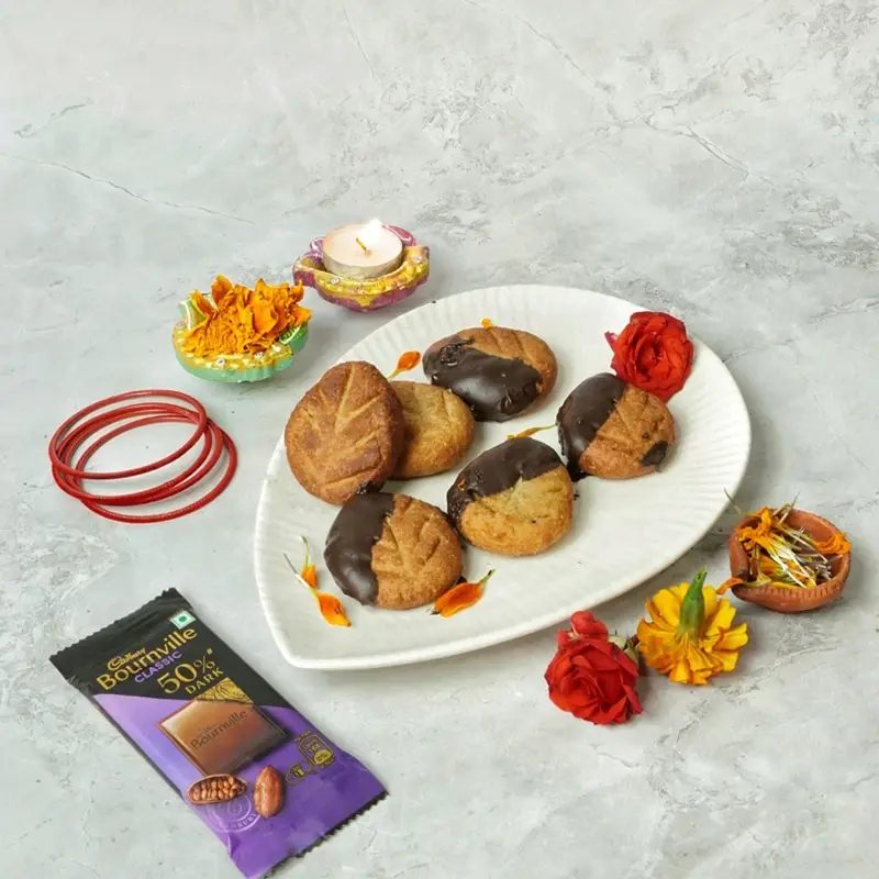 Spread the joy and good vibes of Chhath Pooja with an irresistible chocolatey flavor - Bournville Dipped Thekua unites the rich dark chocolate indulgence with Bihar's authentic traditional.