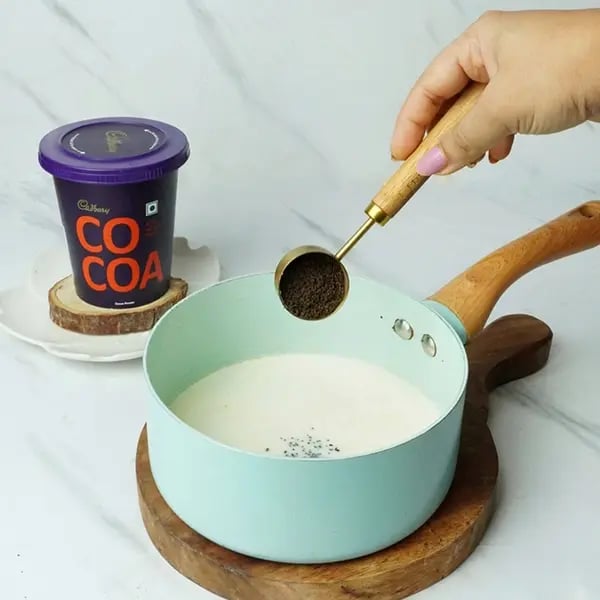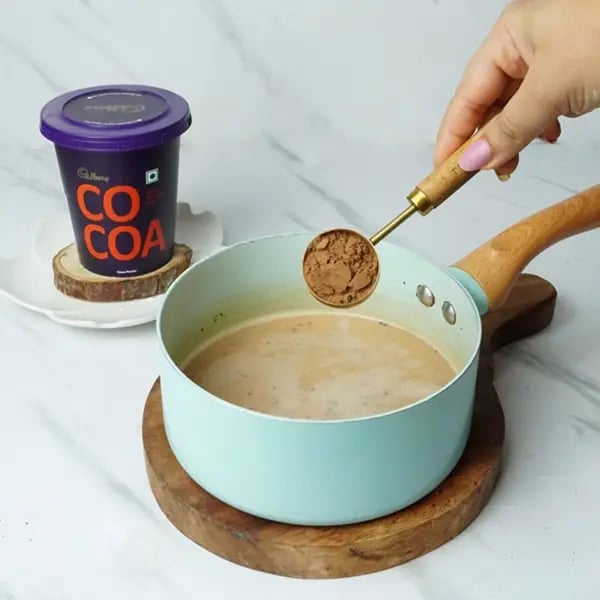Add Cadbury cocoa powder to the hot tea mixture and immediately begin stirring to prevent lumps from forming and to ensure even distribution throughout.
