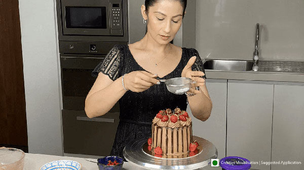 Decorate the cake with chocolate buttercream and strawberries and sprinkle icing sugar on top to give the cake a winter theme. Our winter-themed Eggless Strawberry Chocolate Cake is ready!