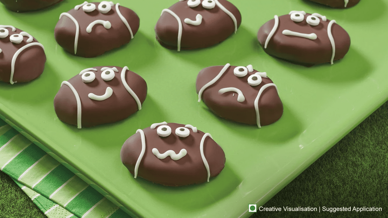 One at a time, dip the footballs into the melted Cadbury Dairy Milk Silk. Turn them around so that each corner is evenly coated. Put them back on the baking sheet.