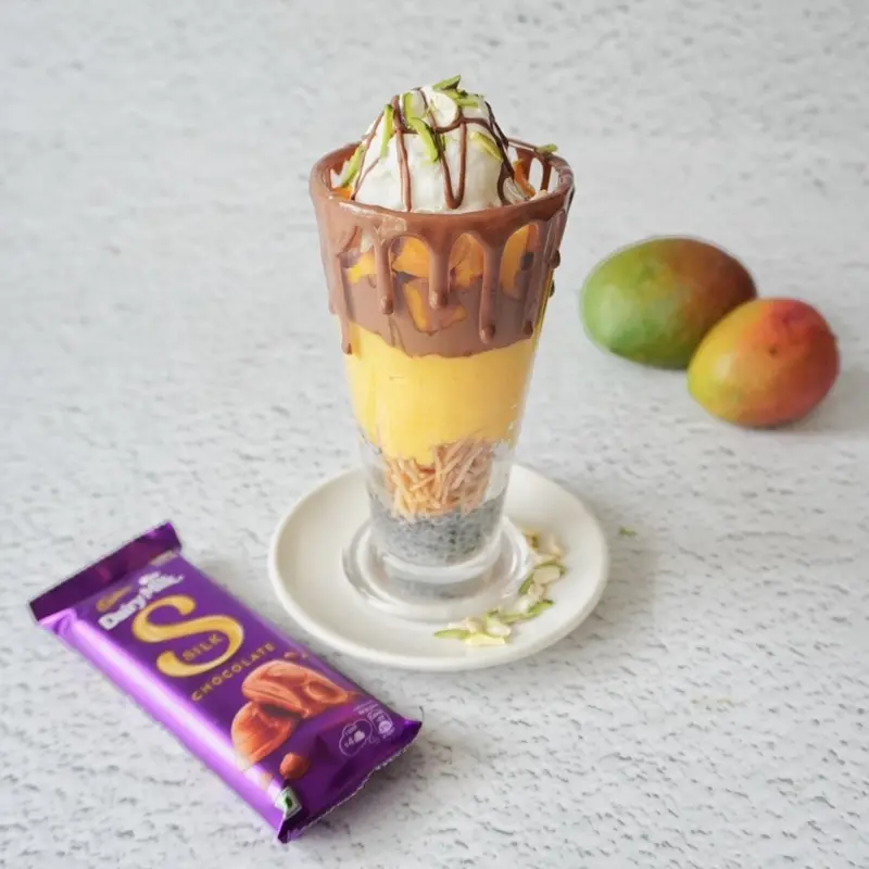 Silk Chocolate Mango Falooda with Sabja Seeds is a refreshing new take on the traditional falooda. Layered with mango milk, melted Silk chocolate, vermicelli, and basil seeds, it's summer's richest dessert drink.